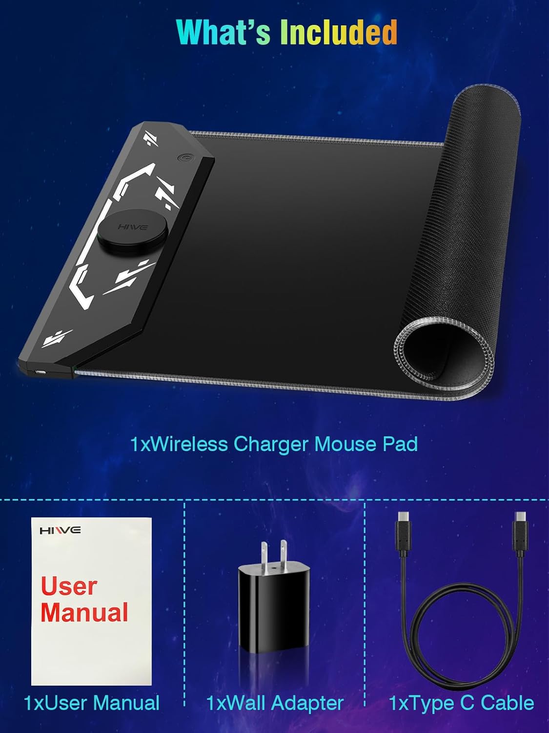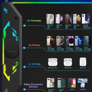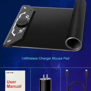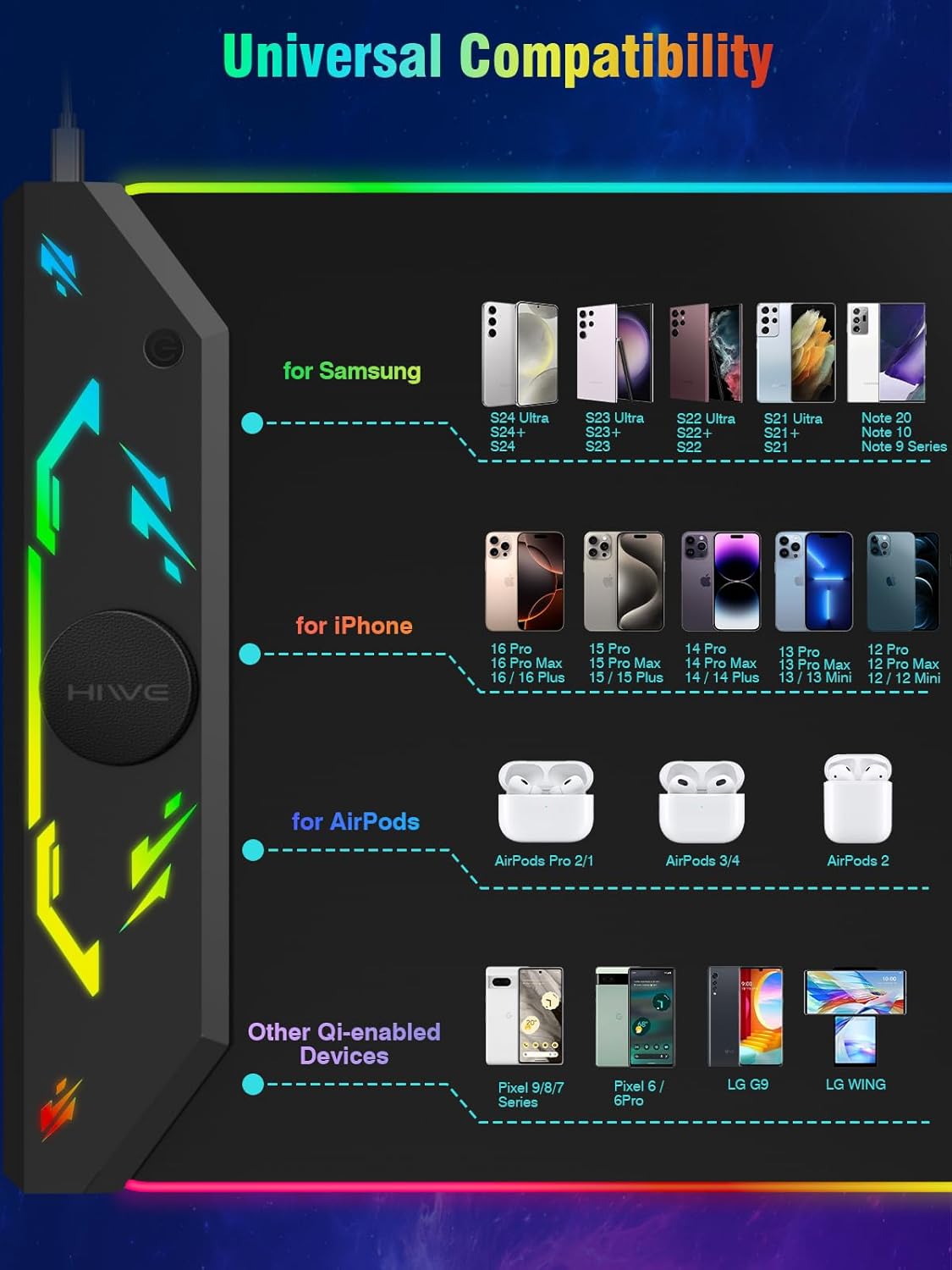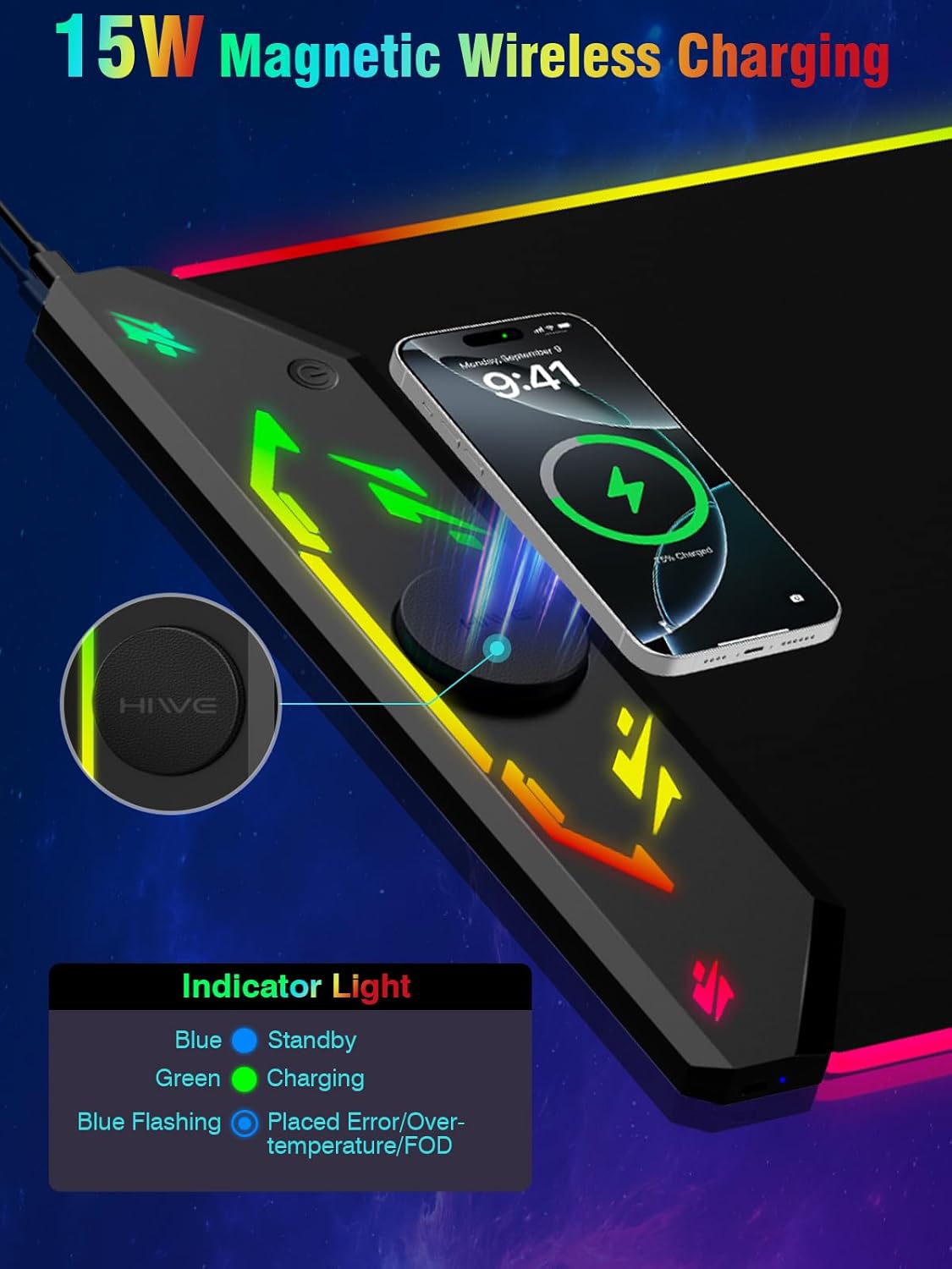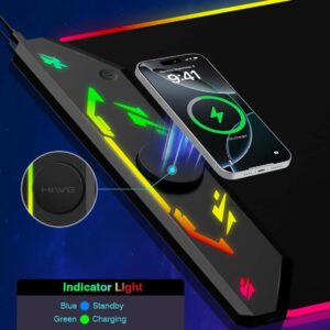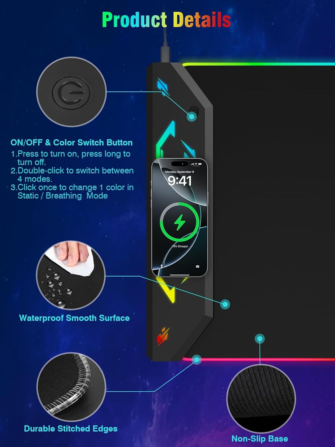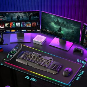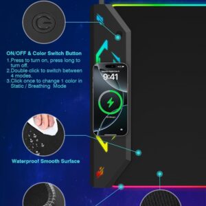 Gaming Mouse Pad RGB, 35″x15.8″ Large Keyboard Desk Mat with Magnetic Wireless Charging for iPhone, 24 Light Effects, Non-Slip Base, Waterproof Ultra-Smooth Surface, with Adapter, Black