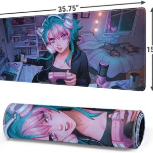 Skinit Extra Large Gaming Mouse Pad – Officially Licensed Anime Catgirl Gamer Nerd Design with Stitched Edges, Waterproof, Non-Slip Rubber Base, Desk Mat for Keyboard & Mouse, 35.75″ x 15.4″ inches